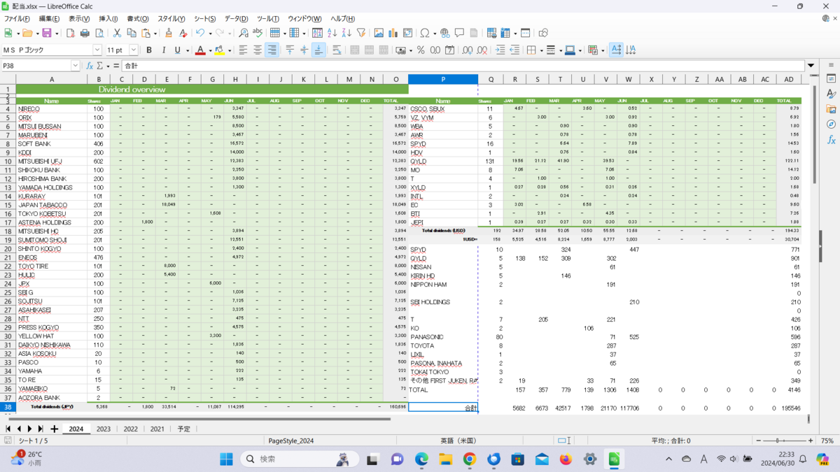 上半期の配当は19.5万ほど。去年の上半期は15.6万ほどだったので増えてきてはいます。